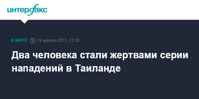 Москва. 19 апреля. INTERFAX.RU - В Таиланде два человека погибли в результате серии атак, предположительно организованных группой сепаратистов в южных провинциях Сонгхала, Паттани и Наратхиват, сообщил в среду сингапурский телеканал Channel News Asia со ссылкой на представителя силовых структур страны.