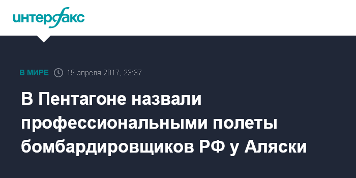 По мнению представителей американского военного ведомства, сопровождение истребителями ВВС США близ Аляски бомбардировщиков ВКС РФ "не было чем- то необычным" и ничем не отличалось от того, "что мы уже видели прежде касательно действий российской дальней авиации".