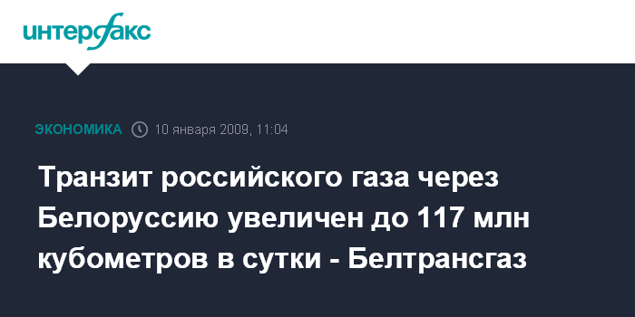 Минск. 10 января. INTERFAX.RU - Транзит российского газа через территорию Белоруссию в направлении Польши вырос до 117 млн кубометров в сутки, сообщили агентству "Интерфакс-Запад" в ОАО "Белтрансгаз".