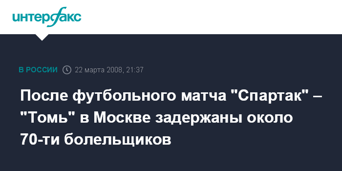 Москва. 22 марта. ИНТЕРФАКС-МОСКВА - Около семидесяти человек были задержаны в Москве после футбольного матча между "Спартаком" и "Томью", сообщили "Интерфаксу" в субботу в Управлении информации и общественных связей ГУВД Москвы.
