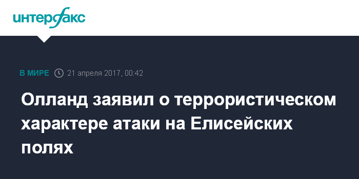 Москва. 21 апреля. INTERFAX.RU - Президент Франции Франсуа Олланд заявил, что атака на Елисейских полях в Париже носила террористический характер.