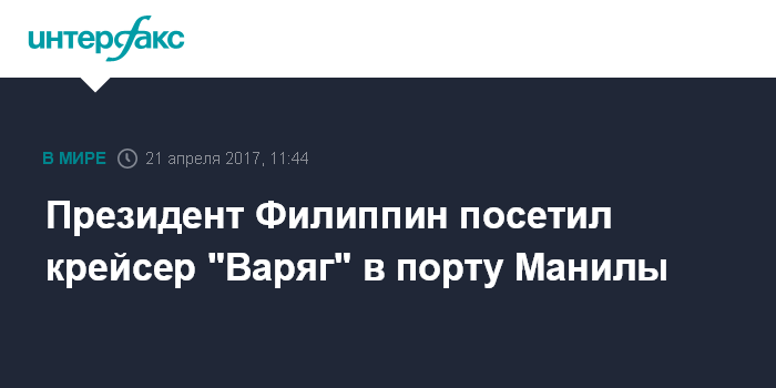 Москва. 21 апреля. INTERFAX.RU - Президент Филиппин Родриго Дутерте посетил флагман Тихоокеанского флота - гвардейский ракетный крейсер "Варяг" в порту Манила. Президент осмотрел флагман Тихоокеанского флота (ТОФ) и ознакомился с его вооружением, сообщили "Интерфаксу" в пятницу в пресс-службе Тихоокеанского флота.