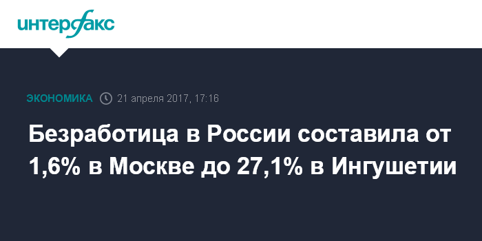 Безработица в России составила от 1,6% в Москве до 27,1% в Ингушетии