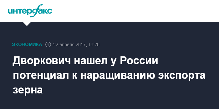 Москва. 22 апреля. INTERFAX.RU - У России есть потенциал к наращиванию экспорта зерна, считает вице-премьер РФ Аркадий Дворкович.