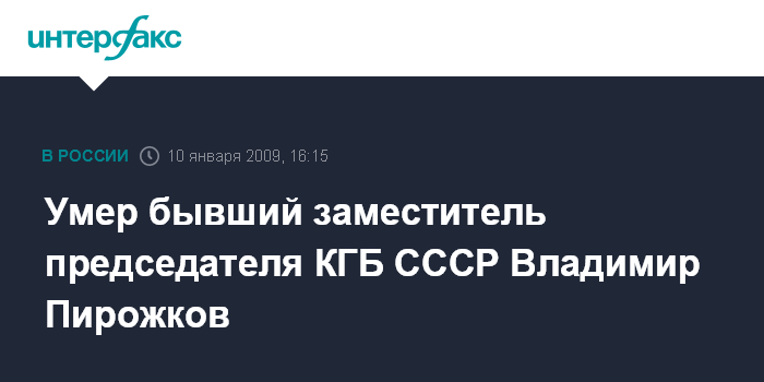Москва. 10 января. INTERFAX.RU - Бывший заместитель председателя КГБ СССР, председатель совета ветеранов ФСБ России Владимир Пирожков скончался 9 января на 85-м году жизни, сообщили "Интерфаксу" в центре общественных связей ФСБ РФ.