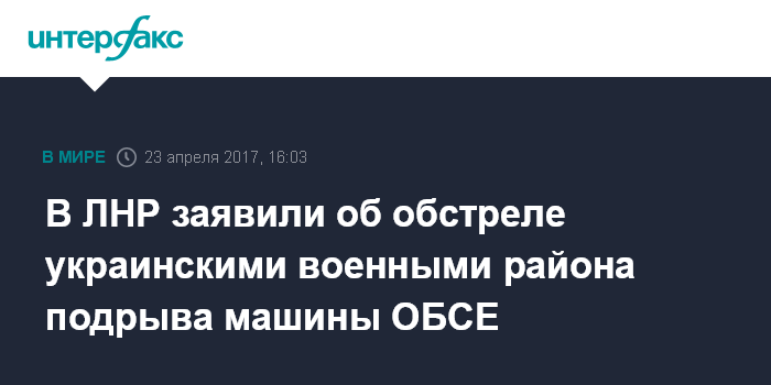 Москва. 23 апреля. INTERFAX.RU - Украинские военные обстреливают район подрыва автомобиля патруля Специальной мониторинговой миссии (СММ) ОБСЕ в окрестностях села Пришиб Славяносербского района, заявил полномочный представитель самопровозглашенной Луганской народной республики на минских переговорах Владислав Дейнего.