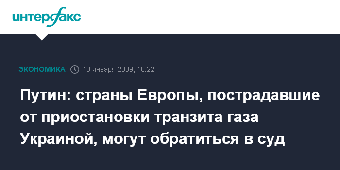 Москва. 10 января. INTERFAX.RU - Премьер-министр РФ Владимир Путин рекомендует европейским странам, пострадавшим от приостановки транзита газа Украиной, обращаться в суд в соответствии с Энергетической хартией.