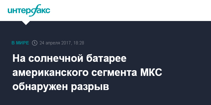 Москва. 24 апреля. INTERFAX.RU - На одной из солнечных батарей американского сегмента Международной космической станции обнаружен разрыв, сообщил "Интерфаксу" источник в ракетно-космической отрасли.