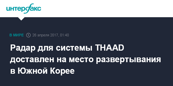 Москва. 26 апреля. INTERFAX.RU - Оборудование американского противоракетного комплекса подвижного наземного базирования для высотного заатмосферного перехвата ракет средней дальности THAAD доставлено на место размещения в Южной Корее, сообщает агентство Yonhap.