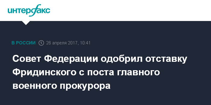 Москва. 26 апреля. INTERFAX.RU - Совет Федерации на заседании в среду освободил Сергея Фридинского от должности главного военного прокурора РФ в связи с его прошением об отставке.