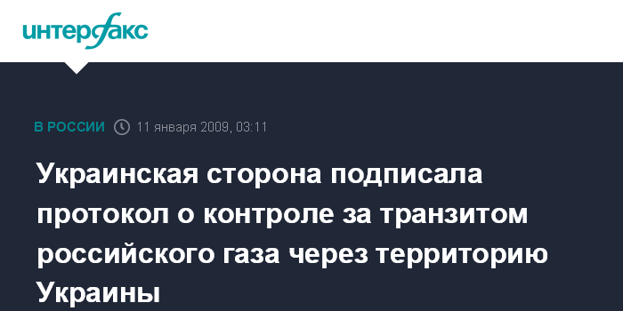 Киев. 11 января. ИНТЕРФАКС-УКРАИНА - Украина подписала протокол о контроле за транзитом российского газа через Украину.