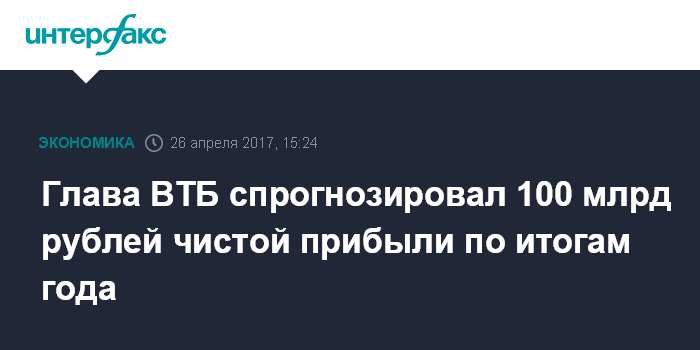 Глава ВТБ спрогнозировал 100 млрд рублей чистой прибыли по итогам года