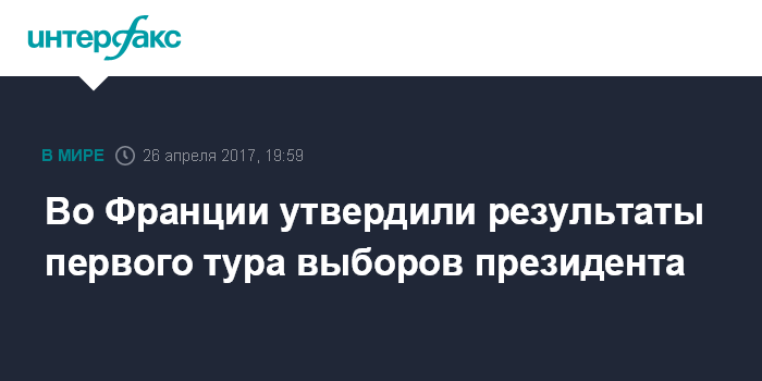 Так, вышедшие во второй тур выборов кандидат от движения "Вперед" Эммануэль Макрон и лидер "Национального фронта" Марин Ле Пен получили 24,01% и 21,30% голосов соответственно. На третьем месте с 20,01 % голосов расположился кандидат от "республиканцев" Франсуа Фийон, замыкает четверку кандидат от движения "Непокоренная Франция" Жан-Люк Меланшон с 19,58%. Число воздержавшихся от участия в выборах составило 22,23%.
