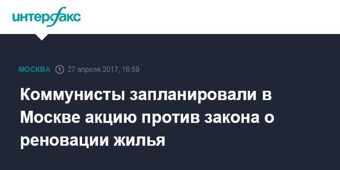 Москва. 27 апреля. INTERFAX.RU - Коммунисты планируют провести в Москве общегородскую акцию с целью привлечения внимания к необходимости принятия поправок в закон о реновации жилья, сообщил журналистам в четверг руководитель фракции КПРФ в Мосгордуме Андрей Клычков. "Мы планируем провести 17 мая общегородскую протестную акцию по поводу программы реновации. Сейчас мы готовимся подать заявку в мэрию", - сказал Клычков.