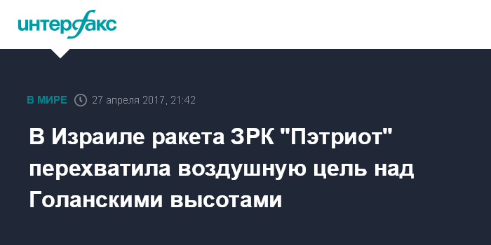 "Система ПВО "Пэтриот" перехватила цель, которая находилась над Голанами", - говорится в сообщении, распространенном в твиттере представителя израильской армии.