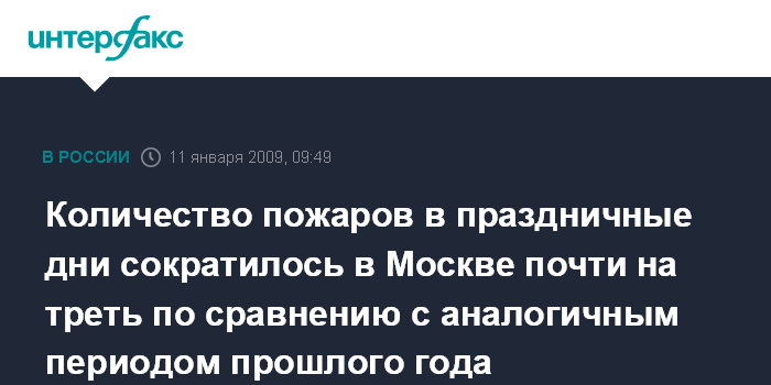 Москва. 11 января. INTERFAX.RU - Во время новогодних и рождественских праздников в столице произошло почти на 100 пожаров меньше, чем за аналогичный период прошлого года, но на этот раз погибло больше людей, сообщили "Интерфаксу" в отделе информации, пропаганды и общественных связей Главного управления МЧС России по Москве в воскресенье.