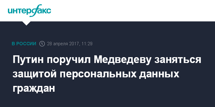 Москва. 28 апреля. INTERFAX.RU - Президент РФ Владимир Путин поручил главе правительства Дмитрию Медведеву обеспечить внесение изменений в федеральное законодательство в целях повышения информационной безопасности государственных информсистем в РФ и защищенности персональных данных граждан России.