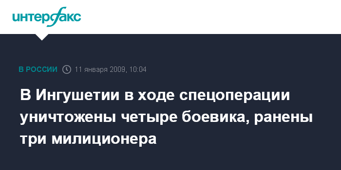 Москва. 11 января. INTERFAX.RU - В станице Орджоникидзевской Сунженского района Ингушетии в ходе проведения спецоперации по задержанию группы боевиков в воскресенье утром четыре преступника уничтожены, ранения получили три милиционера и один местный житель.