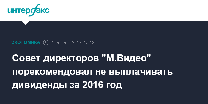 Москва. 28 апреля. INTERFAX.RU - Совет директоров "М.Видео" рекомендовал акционерам не выплачивать дивиденды по итогам 2016 года. Годовое собрание акционеров "М.Видео" состоится 5 июня в Москве. В нем смогут принять участие акционеры, зарегистрированные в реестре по данным на 11 мая, говорится в сообщении ритейлера.