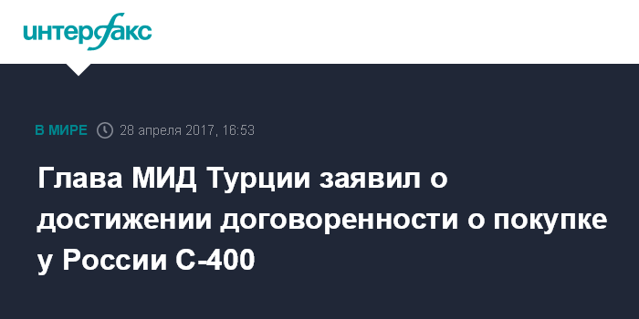 Москва. 28 апреля. INTERFAX.RU - Турция может закупить у России ЗРС С-400, обсуждается вопрос совместного производства, сообщил в пятницу Haberturk со ссылкой на главу турецкого МИД Мевлюта Чавушоглу.