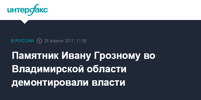 Москва. 28 апреля. INTERFAX.RU - Монумент Ивану Грозному, установленный для торжественного открытия в городе Александров Владимирской области, демонтировали по распоряжению местных властей, сообщил президент фонда сохранения культурного наследия "Русский Витязь" Дмитрий Лысенков.
