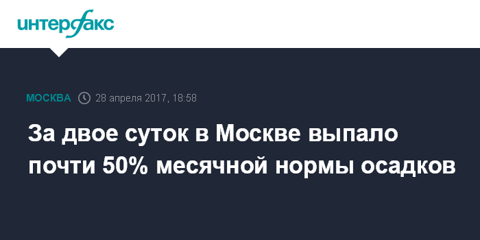 Москва. 28 апреля. INTERFAX.RU - Прирост осадков в столице с вечера среды составил 21 мм, сообщает Гидрометцентр России.