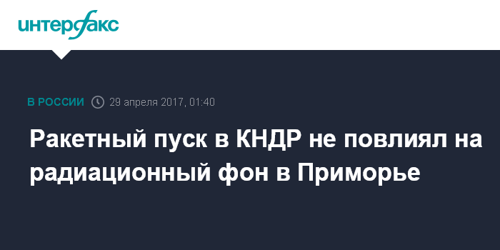 Москва. 29 апреля. INTERFAX.RU - Радиационный фон в Приморье остается в норме и не изменился после очередного ракетного испытания в КНДР.