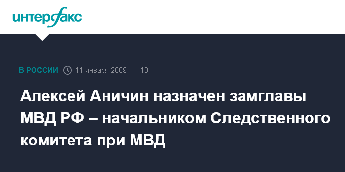 Москва. 11 января. INTERFAX.RU - Президент России Дмитрий Медведев назначил генерал-майора юстиции Алексея Аничина заместителем министра внутренних дел РФ - начальником Следственного комитета при МВД РФ, сообщила в воскресенье пресс-служба главы государства.