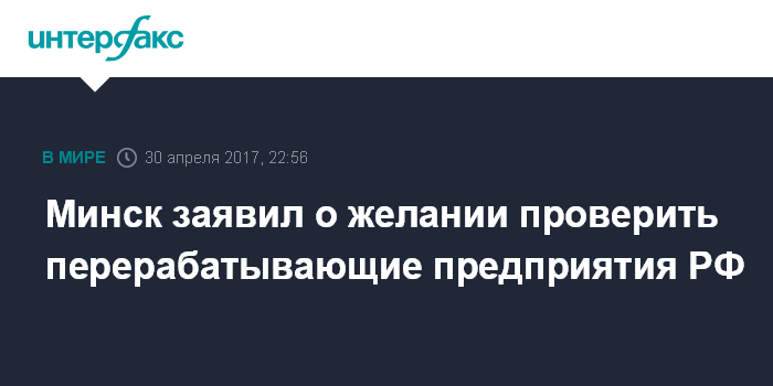 Москва. 30 апреля. INTERFAX.RU - Белоруссия хотела бы провести инспекцию российских перерабатывающих предприятий, но пока такого приглашения от российской стороны не поступало, заявил министр сельского хозяйства и продовольствия республики Леонид Заяц в интервью телеканалу "Беларусь-1" в воскресенье.