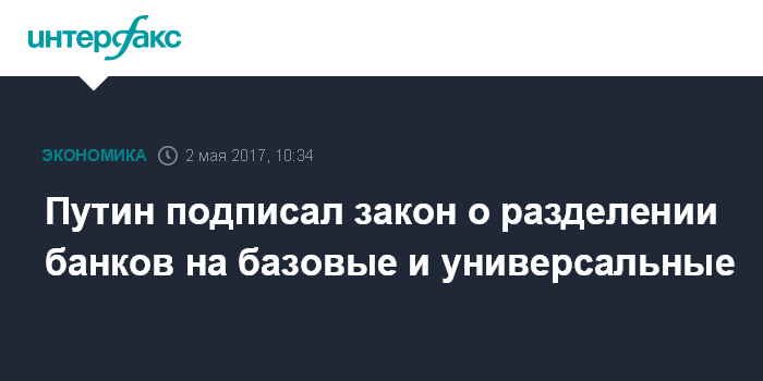 Москва. 2 мая. INTERFAX.RU - Президент России Владимир Путин подписал закон о разделении банков по перечню разрешенных операций в зависимости от их лицензии.