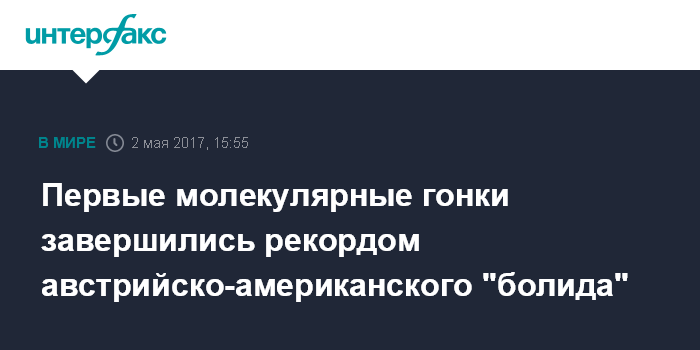 Москва. 2 мая. INTERFAX.RU - В Тулузе 28-29 апреля прошла первая в истории гонка молекулярных машин. Успешно пройти 100-нанометровую трассу удалось двум командам из шести, участвовавших в гонке: австрийско-американской и швейцарской. На третьем месте оказалась команда из Огайо, преодолевшая около 45 нанометров дистанции за 30 часов гонки, сообщает сайт N+1.