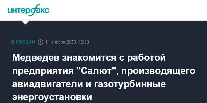 Москва. 11 января. INTERFAX.RU - Президент России Дмитрий Медведев посещает в воскресенье Московское машиностроительное производственное объединение "Салют".