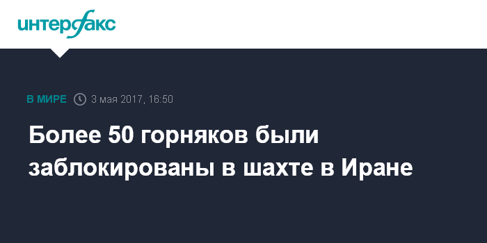 Москва. 3 мая. INTERFAX.RU - Более 50 горняков остаются заблокированными в шахте в Иране после произошедшего взрыва. Как сообщает "Би-би-си" со ссылкой на местные СМИ, инцидент произошел на севере страны в провинции Голестан.