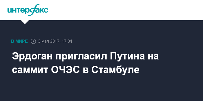 Москва. 3 мая. INTERFAX.RU - Президент Турции Реджеп Тайип Эрдоган пригласил президента РФ Владимира Путина принять участие в саммите Организации Черноморского экономического сотрудничества (ОЧЭС), который пройдет 22 мая в Стамбуле.