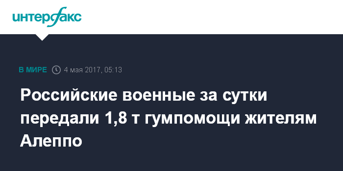 Москва. 4 мая. INTERFAX.RU - В течение суток российский Центр по примирению враждующих сторон на территории Сирии провел шесть гуманитарных акций в провинции Алеппо, жителям передано более 1,8 т продуктов питания, сообщает в четверг Минобороны РФ.