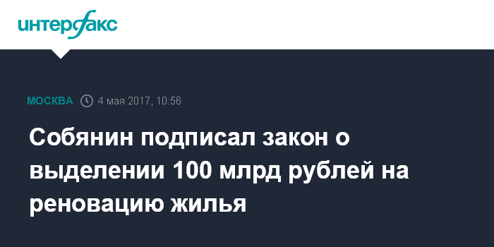 Собянин подписал закон о выделении 100 млрд рублей на реновацию жилья