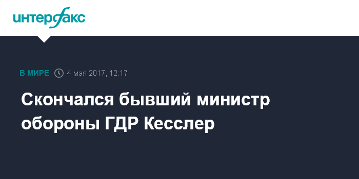 Москва. 4 мая. INTERFAX.RU - Бывший глава Минобороны ГДР Хайнц Кесслер скончался на 98-м году жизни, сообщили в четверг германские СМИ.