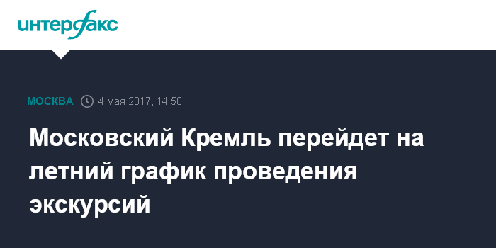 "В связи с началом летнего туристического сезона, в период с 15 мая по 30 сентября 2017 года допуск граждан в Московский Кремль с экскурсионными целями будет осуществляться с 9:30 до 17:00", - говорится в сообщении ФСО, поступившем в "Интерфакс".