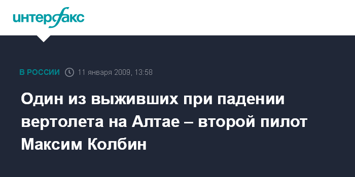 Москва. 11 января. INTERFAX.RU - По предварительным данным, среди выживших при крушении вертолета Ми-171 в Республике Алтай - второй пилот Максим Колбин, сообщил "Интерфаксу" губернатор республики Александр Бердников.