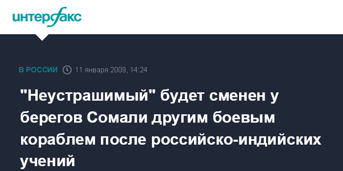 После учений один из кораблей ВМФ РФ сменит сторожевой корабль Балтийского флота "Неустрашимый", который обеспечивает защиту гражданских судов от сомалийских пиратов в районе Африканского Рога с октября 2008 года, сказал Н.Макаров.
