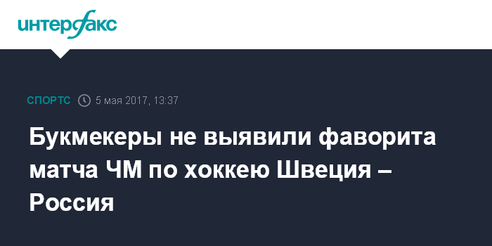 Москва. 5 мая. INTERFAX.RU - Шансы сборных Швеции и России по хоккею на победу в стартовом матче чемпионата мира равны, свидетельствуют котировки британской букмекерской конторы William Hill.