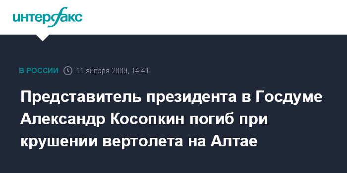 Москва. 11 января. INTERFAX.RU - Среди выживших при крушении вертолета Ми-171 в Республике Алтай представителя президента РФ в Госдуме Александра Косопкина нет.
