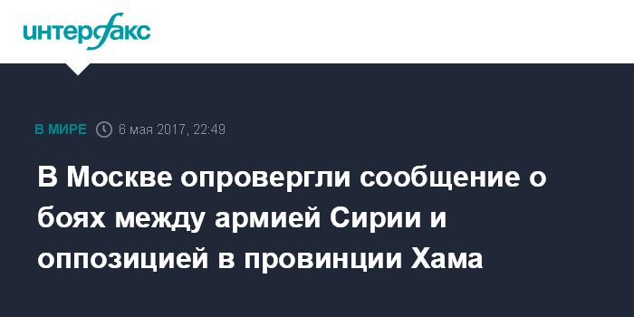 Москва. 6 мая. INTERFAX.RU - В Министерстве обороны России опровергли сообщение некоторых СМИ о боях в Сирии между правительственной армией и оппозицией в провинции Хама; там были подавлены огневые точки террористической группировки "Джабхат ан-Нусра" (запрещена в РФ).