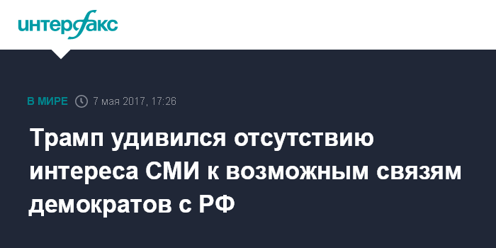 Москва. 7 мая. INTERFAX.RU - Президент США Дональд Трамп упрекнул СМИ в отсутствии интереса к предполагаемым связям американской партии демократов с Россией.