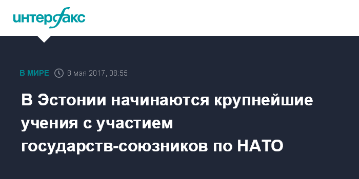 Москва. 8 мая. INTERFAX.RU - В Эстонии в понедельник начинаются военные учения "Весенний шторм" с участием около 9-ти тысяч военнослужащих Эстонии, а также государств-союзников по НАТО и партнеров.