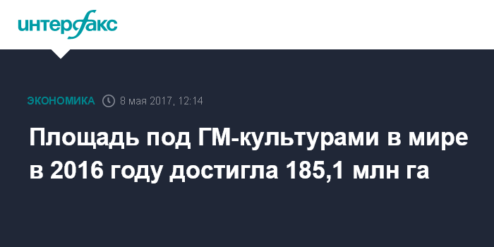 Москва. 8 мая. INTERFAX.RU - Площадь под сельхозкультурами с генно-модифицированными источниками (ГМ-культуры) в 2016 году достигла 185,1 млн тонн против 179,7 млн га в 2015 году, сообщает международная служба по мониторингу за применением агробиотехнологий (International Service for the Acquisition of Agri-biotech Applications, ISAAA).