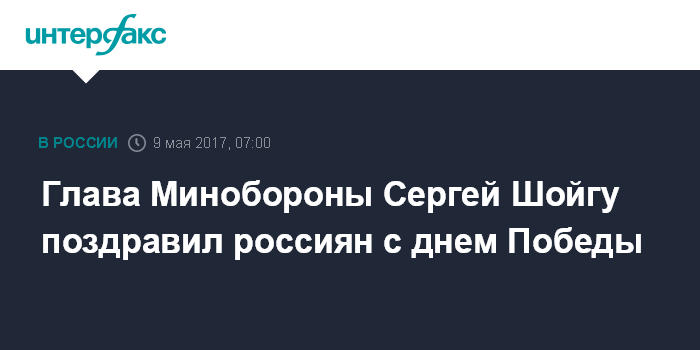 Москва. 9 мая. INTERFAX.RU - Министр обороны России Сергей Шойгу поздравил военнослужащих и ветеранов с Днем Победы.