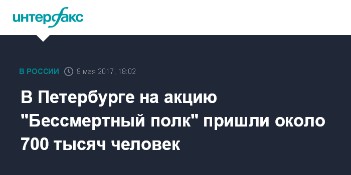 Москва. 9 мая. INTERFAX.RU - Около 700 тыс. человек приняли участие в акции памяти "Бессмертный полк" в Петербурге в 72-ю годовщину Победы в Великой Отечественной войне, сообщили "Интерфаксу" в комитете по вопросам законности, правопорядка и безопасности правительства города.