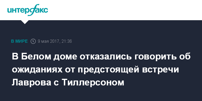 Москва. 9 мая. INTERFAX.RU - В Белом доме не стали говорить об ожиданиях от предстоящей 10 мая встречи главы МИД РФ Сергея Лаврова с госсекретарем США Рексом Тиллерсоном.