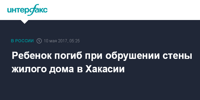Москва. 10 мая. INTERFAX.RU - Под завалом дома в Аскизе, Хакасия, погиб четырехлетний ребенок, сообщило правительство республики в среду. При обрушении также есть пострадавшие.